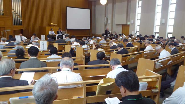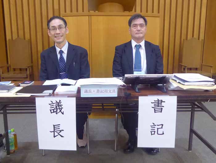 ![]() 大会議場のようす(柏木教会) ![]() 新議長:中家契介(左) 書記:齋藤 修(右) |